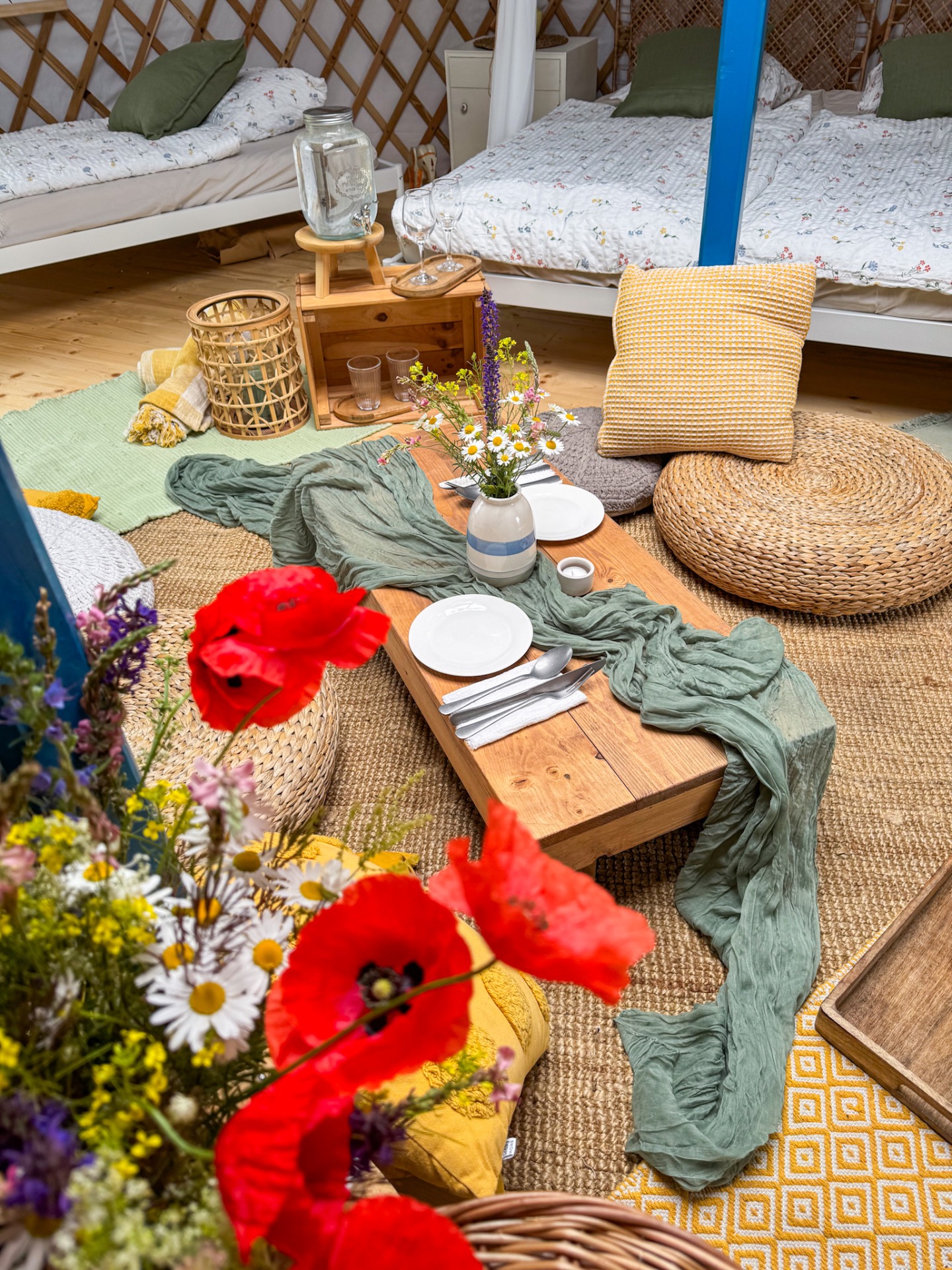 Mobiliář a dekorace: Dřevěný stolek se stylovou látkou, 2 proutěné pufy, dřevěné přepravky, set tří malých bedýnek pro odkládání drobností.