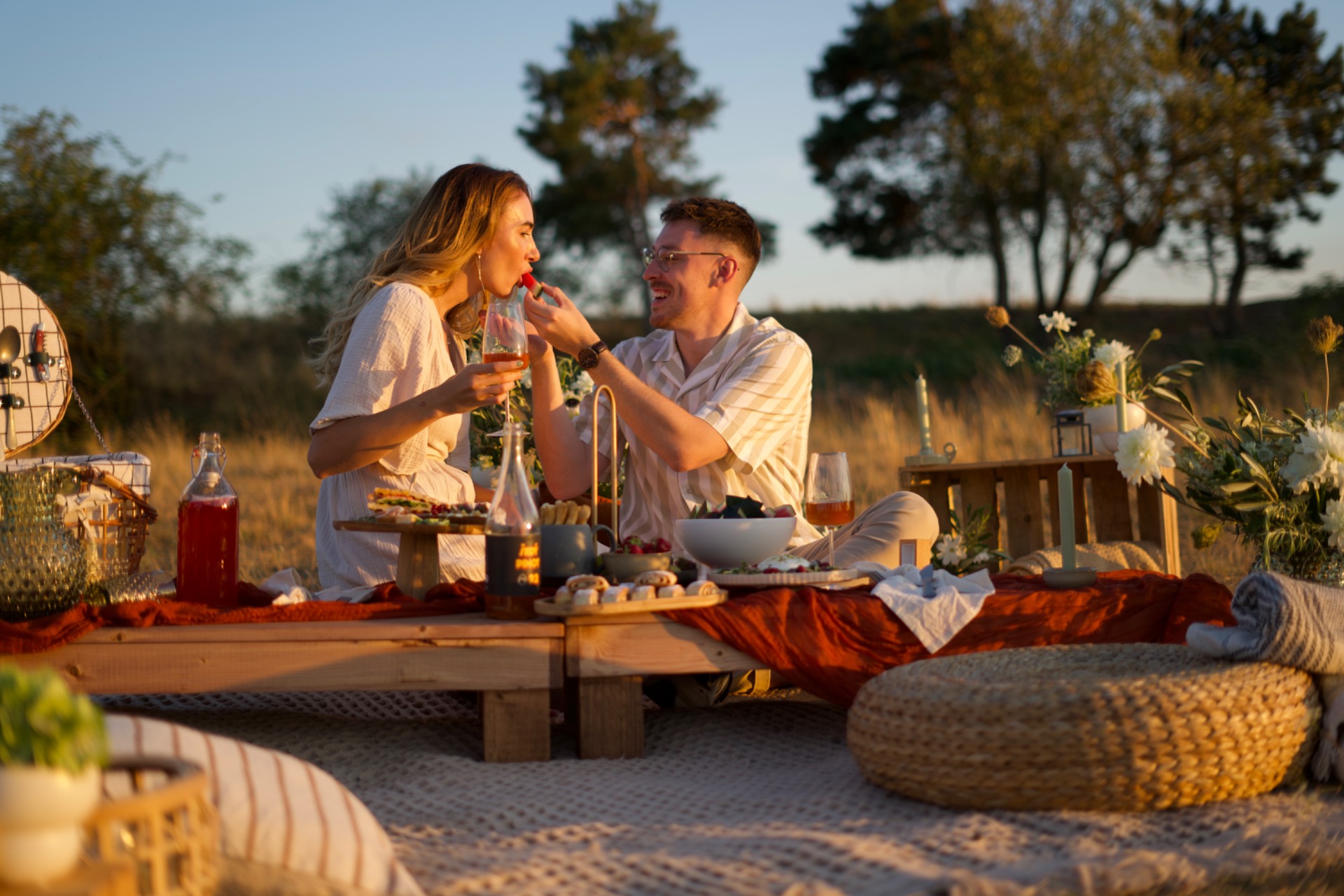 Atmosféra: proutěné lucerny, svícny na čajové svíčky a vázičky s květinovou dekorací, které dodají pikniku tu správnou piknikovou náladu.